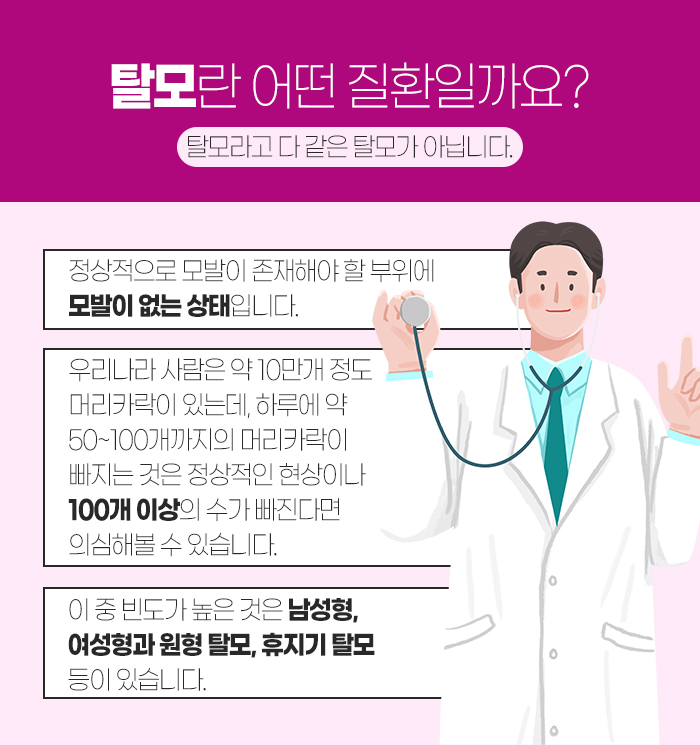 그리고 탈모라는 질환에 대해 이야기해 보자면 모발이 정상적으로 있어야 하는 부위에 없는 상태를 말하는데요. 우리나라 사람은 모발의 수가 약 10만 개 정도 되는데, 하루에 50~100개까지 빠지게 되는 것이 정상적인 현상이랍니다. 그런데 100개 이상의 수가 빠진다면 앞서 말씀을 드린 것처럼 탈모를 의심해 보도록 해야 하는데요. 빈도가 높은 탈모에는 남성형 탈모와 여성형 탈모, 원형 탈모, 휴지기 탈모 등이 있답니다.