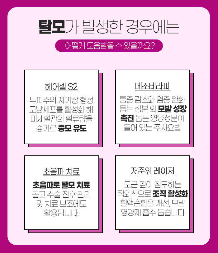 초음파 치료는 피부 치료에 사용되는 초음파로 탈모 치료를 돕는 방법을 말한답니다. 다양한 시술과 병행하여 사용할 수 있고 수술 전후 관리 및 치료를 하는 치료에 보조적으로 활용되고 있습니다.