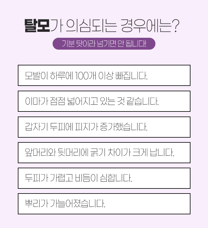 또 다음과 같은 증상이 나타난다면 의정부 장암동 탈모가 맞는지 진단을 받으러 가셔야 하는데요.