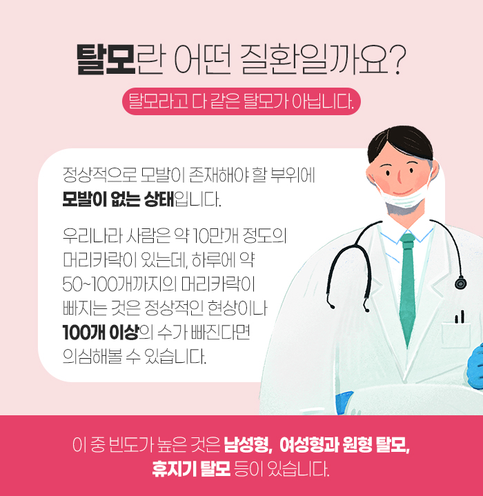 우선 설명부터 해보자면 모발이 정상적으로 있어야 하는 부위에 모발이 없는 상태를 말한답니다. 참고로 우리나라 사람은 약 10만 개 정도의 모발이 있는데요. 이 중 하루에 빠지는 모발의 수는 50개에서 100개까지가 정상적인 현상이랍니다.