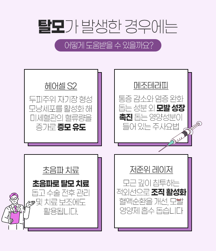 또 메조테라피는 피부의 중간층에 미네랄과 비타민 등을 주사하는 주사요법을 말하는데요. 통증을 감소시키는 성분과 염증을 가라앉히는 성분, 모발의 성장을 촉진시키는 비타민과 성장인자 및 미네랄 등이 들어 있습니다.