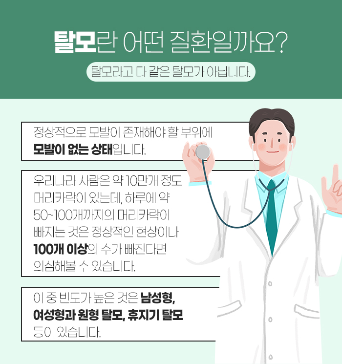 또 의정부 녹양동 탈모란 질환에 대해 알아보자면 모발이 정상적으로 존재해야 하는 부위에 모발이 없는 상태를 말합니다. 우리나라 사람의 경우 약 10만 개 정도의 모발이 있는데요. 이 중에서 하루에 빠지는 모발의 수는 50개에서 100개까지입니다.