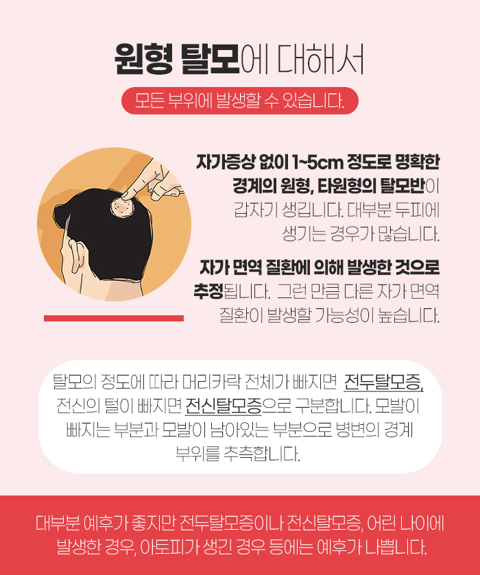 그리고 원형 탈모가 심해지게 되면 전두탈모증이나 전신탈모증으로 발전하게 됩니다. 전두탈모증은 머리카락 전체가 빠지게 되는 것을 말하고, 전신탈모증은 전신의 털이 빠지게 되는 것을 말하는데요. 이때 모발이 빠지는 부분 부분과 모발이 남아 있는 부분으로 병변의 경계 부위를 추측하게 됩니다.