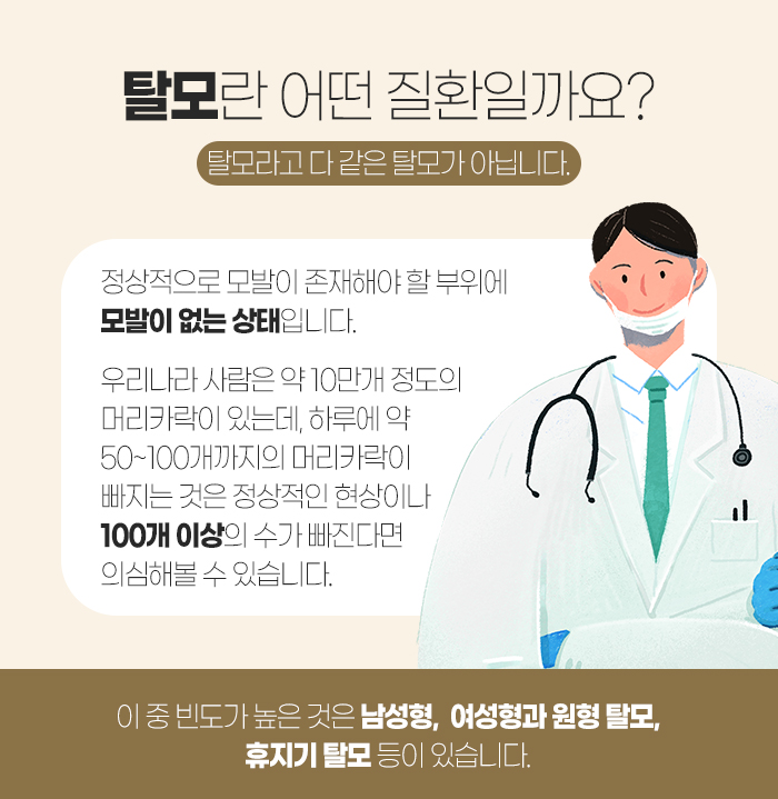 그리고 탈모에 대해 말해보자면 모발이 정상적으로 있어야 하는 부위에 없는 상태를 말합니다. 우리나라 사람의 경우에는 약 10만 개 정도의 모발이 있는데요. 여기서 하루에 빠지는 모발의 수는 평균적으로 50개에서 100개까지입니다.