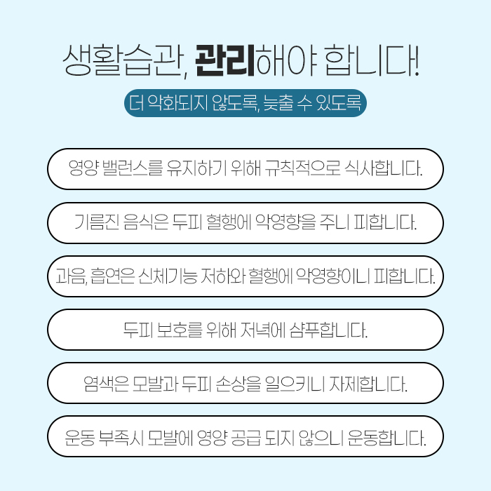 또 담배가 몸에 좋지 않다는 말 많이 들어보실 텐데요. 담배를 피우게 되면 혈관이 수축되고 머리에 산소를 공급하는 혈액의 흐름이 나빠지게 됩니다. 이는 탈모의 원인이 되기도 하는데, 안 그래도 담배가 건강에 좋지 않은 만큼 금연하시는 게 좋습니다.