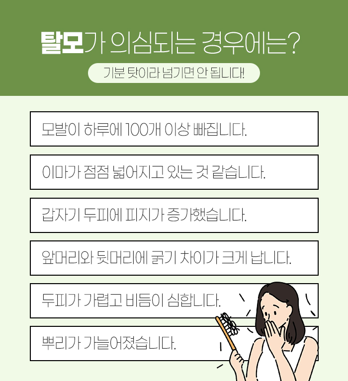 그리고 다음과 같은 증상이 나타나는 경우 탈모를 의심해 볼 수 있습니다.