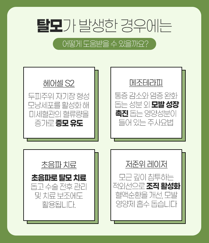 또 메조테라피는 통증을 감소시키고 염증을 가라앉히는 성분과 모발 성장을 촉진시키는 성분이 들어간 주사 요법인데요. 피부의 증간층에 주사하게 됩니다. 그리고 초음파 치료는 피부 치료에 사용되는 초음파를 탈모 치료를 위해 사용하게 되는 방법을 말합니다. 또 저분위 레이저는 모근 깊이 침투하는 적외선을 통해 조직을 활성화시키고 혈액순환을 개선하는데 도움을 줍니다. 그리고 모발 영양제의 흡수를 돕는답니다.