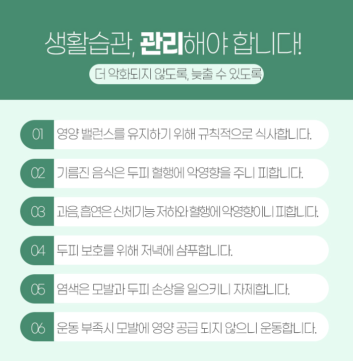 또 운동을 꾸준히 해주는 게 좋은데요. 운동량이 부족하게 되면 혈액의 산소량이 줄어들게 되면서 머리로 영양 공급이 잘 되지 않는답니다. 그래서 운동 또한 꾸준히 해주어야 합니다. 그리고 자외선을 피해야 합니다. 자외선을 받게 될 경우 머리에 큐티클과 두피에 손상을 줄 수 있으며, 이로 인해 탈모가 발생하게 되기 때문입니다.