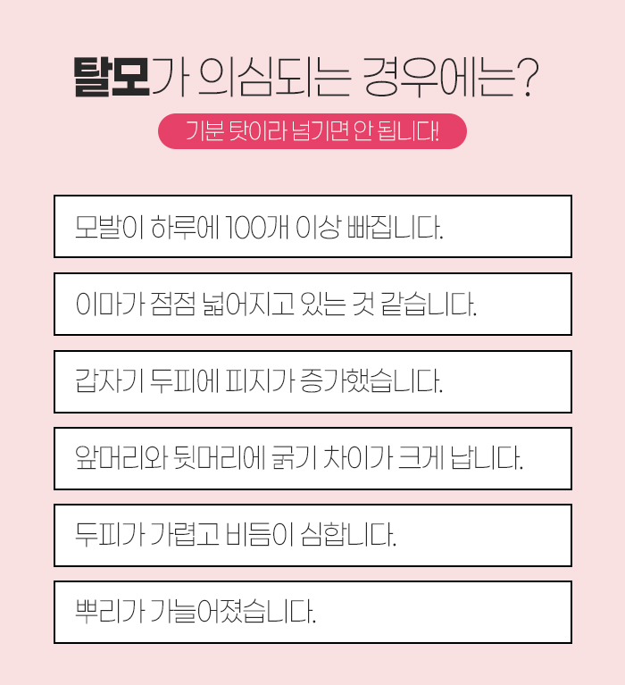 그런데 100개 이상의 수가 빠진다면 탈모를 의심하도록 해야 하는데요. 특히 남성형 탈모와 여성형 탈모, 원형 탈모, 휴지기 탈모의 빈도가 높은 편이랍니다.