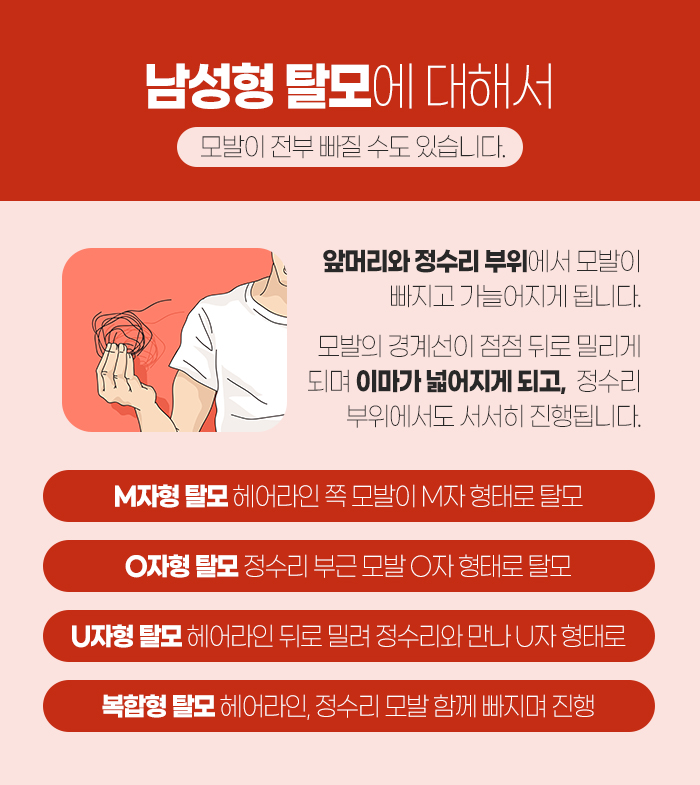 또 남성형 탈모는 M자형 탈모와 O자형 탈모, U자형 탈모, 복합형 탈모가 있는데요. 이 중 M자형 탈모는 헤어라인 쪽 모발이 M자 형태로 빠지게 되는 것을 말합니다. 그리고 O자형 탈모는 정수리 부근의 모발이 O자 형태로 빠지게 되는 것을 말하고, U자형 탈모는 헤어라인이 뒤로 밀리게 되면서 정수리와 만나 U자 형태로 빠지게 되는 것을 말합니다. 또 복합형 탈모는 헤어라인과 정수리 부위의 모발이 함께 빠지면서 진행되는 것을 말하는데요.