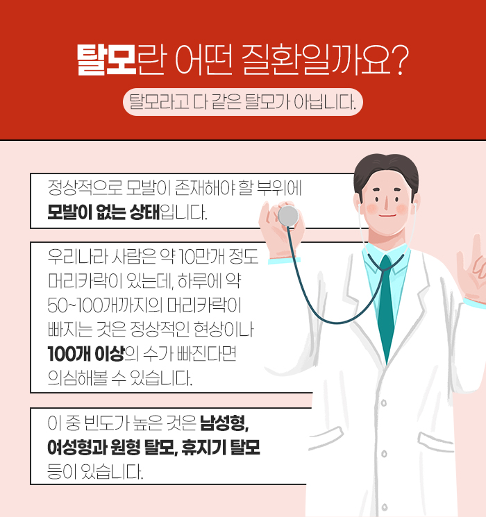 그래서 탈모에 대해 대략적으로 설명해 보자면 모발이 정상적으로 있어야 하는 부위에 모발이 없는 상태를 말하는데요. 우리나라 사람은 약 10만 개 정도의 모발이 있는데 이 중 하루에 빠지는 평균적인 모발의 양은 50개에서 100개까지입니다.