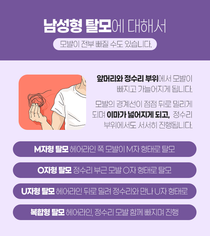 이러한 남성형 탈모는 M자형 탈모와 O자형 탈모, U자형 탈모, 복합형 탈모가 있습니다. M자형 탈모는 헤어라인 쪽 모발이 M자 형태로 빠지게 되는 것을 말하고, O자형 탈모는 정수리 부근의 모발이 O자 형태로 빠지게 되는 것을 말합니다. 또 U자형 탈모는 헤어라인이 뒤로 밀리면서 정수리와 만나 U자 형태로 빠지게 되는 것을 말하고, 복합형 탈모는 헤어라인과 정수리 부위의 모발이 함께 빠지면서 진행되는 것을 말합니다.