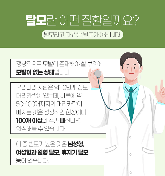 탈모는 모발이 정상적으로 존재해야 하는 부위에 모발이 없는 상태를 말합니다. 우리나라 사람의 경우에는 평균적으로 약 10만 개 정도의 모발이 있는데요. 여기서 하루에 빠지는 모발의 평균적인 수는 50개에서 100개까지입니다.