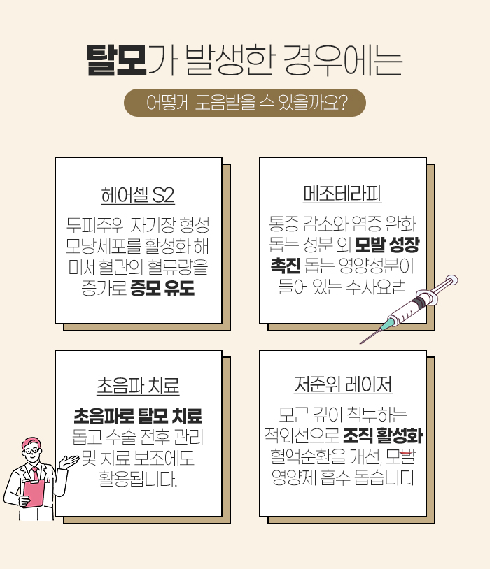 또 의정부 낙양동 탈모약처방을 받는 것도 좋지만 헤어셀이나 메조테라피, 초음파 치료, 저준위 레이저와 같은 방법을 통해 도움을 받으시는 경우가 적지 않은데요. 그래서 이에 대해서도 설명해 보자면