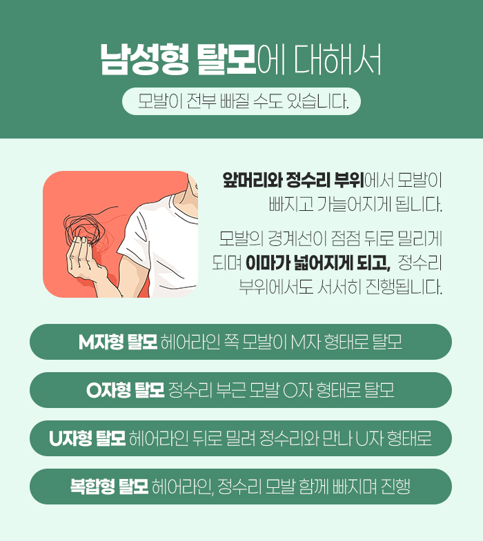 모발의 경계선이 갈수록 뒤로 밀리면서 이마가 넓어지게 되는데요. 정수리 부위에도 서서히 탈모가 진행됩니다. 그리고 증상이 발생하는 양상에 따라서 M자형 탈모, O자형 탈모, U자형 탈모, 복합형 규모로 나뉜답니다.