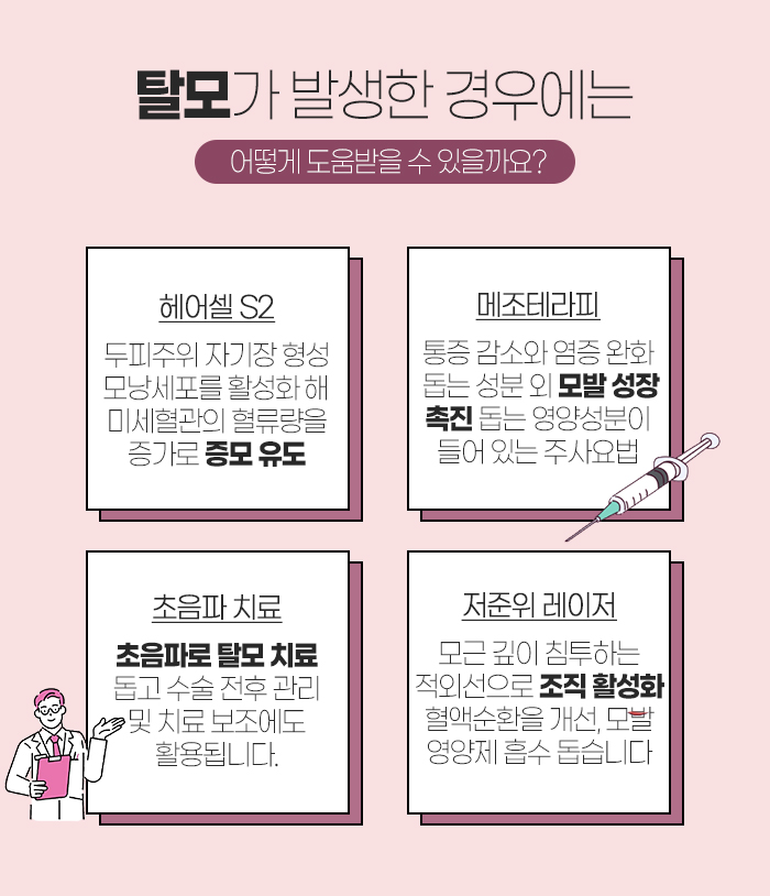 헤어셀은 두피주의에 자기장을 형성해서 모낭세포를 활성화시키고 미세혈관의 혈류량을 증가시켜 증모를 유도하는데 도움을 주는 방법을 말합니다. 메조테라피는 통증을 감소시키는 성분과 염증을 완화시키는 성분, 모발의 성장을 촉진시키는 성분이 들어 있는 주사요법을 말하는데요. 피부의 중간층에 주사하게 됩니다.