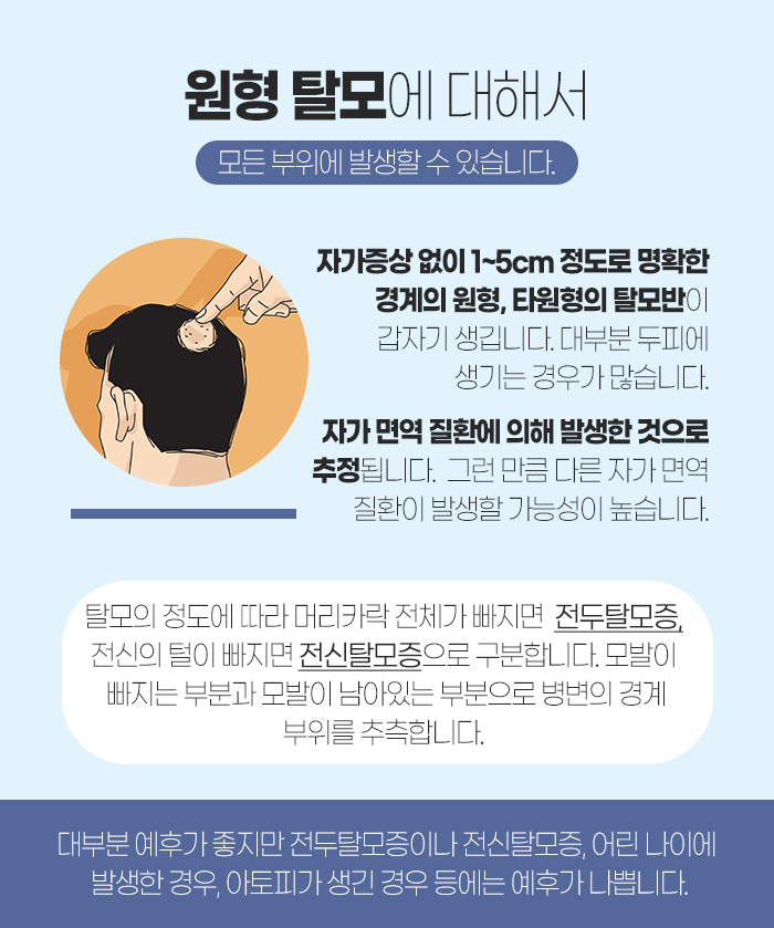 또 보통은 예후가 좋은 편인데요. 하지만 전두탈모증이나 전신탈모증, 어린 나이에 원형 탈모가 발생한 경우, 아토피가 있는 경우에는 예후가 좋지 못한 만큼 이런 경우 빠른 시일 내에 진단을 받아 의정부 용현동 탈모약처방 등을 도움받는 것이 좋습니다.